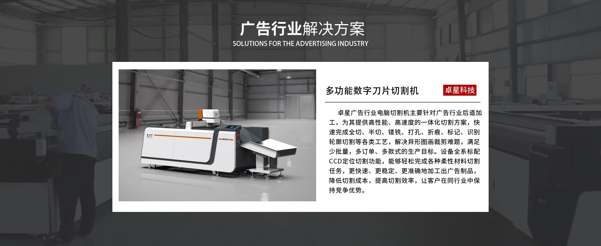 卓星廣告行業(yè)電腦切割機(jī)主要針對廣告行業(yè)后道加工,為其提供高性能、高速度的一體化切割方案,快速完成全切、半切、鏤銑、打孔、折痕、標(biāo)記、識(shí)別輪廓切割等各類工藝,解決異形圖畫裁剪難題,滿足少批量,多訂單、多款式的生產(chǎn)目標(biāo)。設(shè)備全系標(biāo)配CCD定位切割功能,能夠輕松完成各種柔性材料切割任務(wù),更快速、更穩(wěn)定、更準(zhǔn)確地加工出廣告制品,降低切割成本,提高切割效率,讓客戶在同行業(yè)中保持競爭優(yōu)勢。